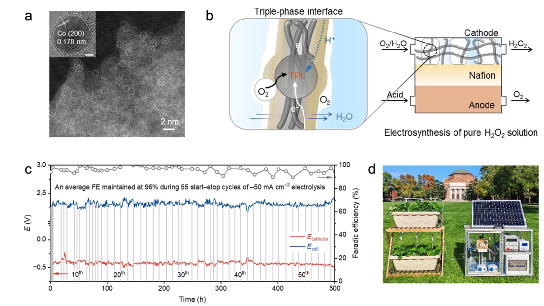 Figure 2. (a) Oxygen-coordinated cobalt single-atom catalyst. (b) Triple-phase interface engineering strategy for pure hydrogen peroxide electrosynthesis. (c) 500-hour stability test. (d) Demonstration of the green electrosynthesis system for smart agriculture.