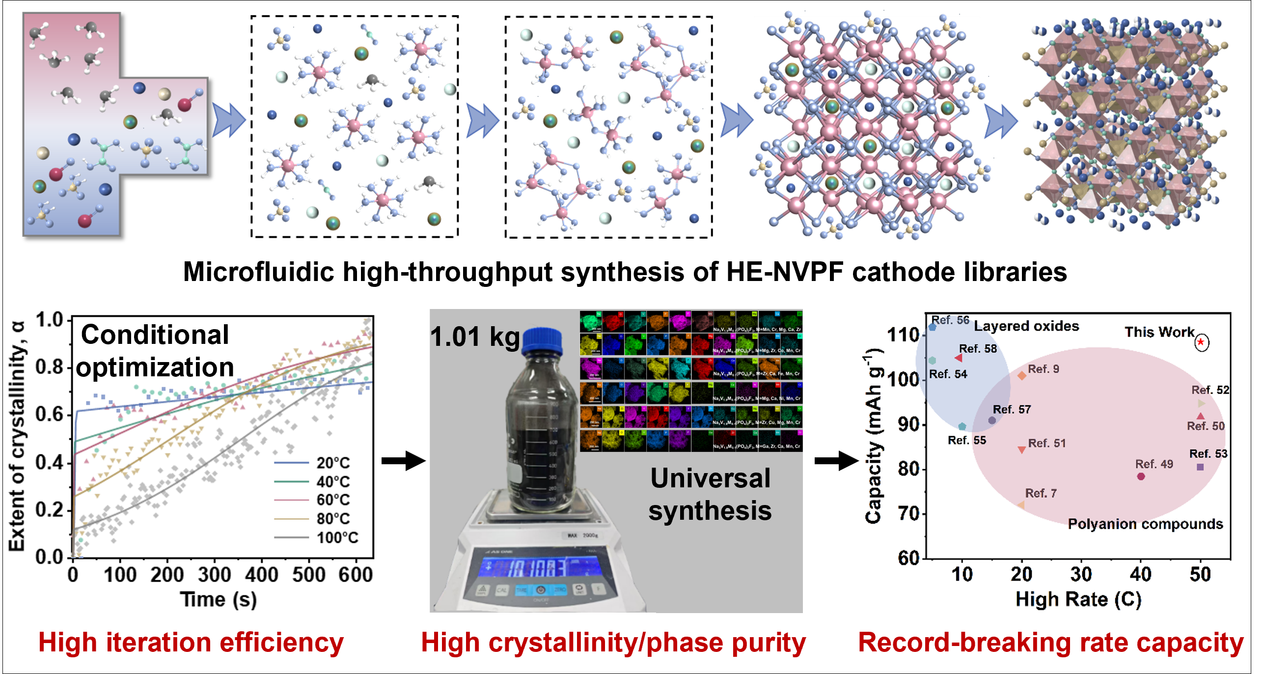 Figure 1. Microfluidic high-throughput optimization guides the continuous-flow synthesis of high-entropy sodium vanadium fluorophosphate, achieving record-high rate performance.