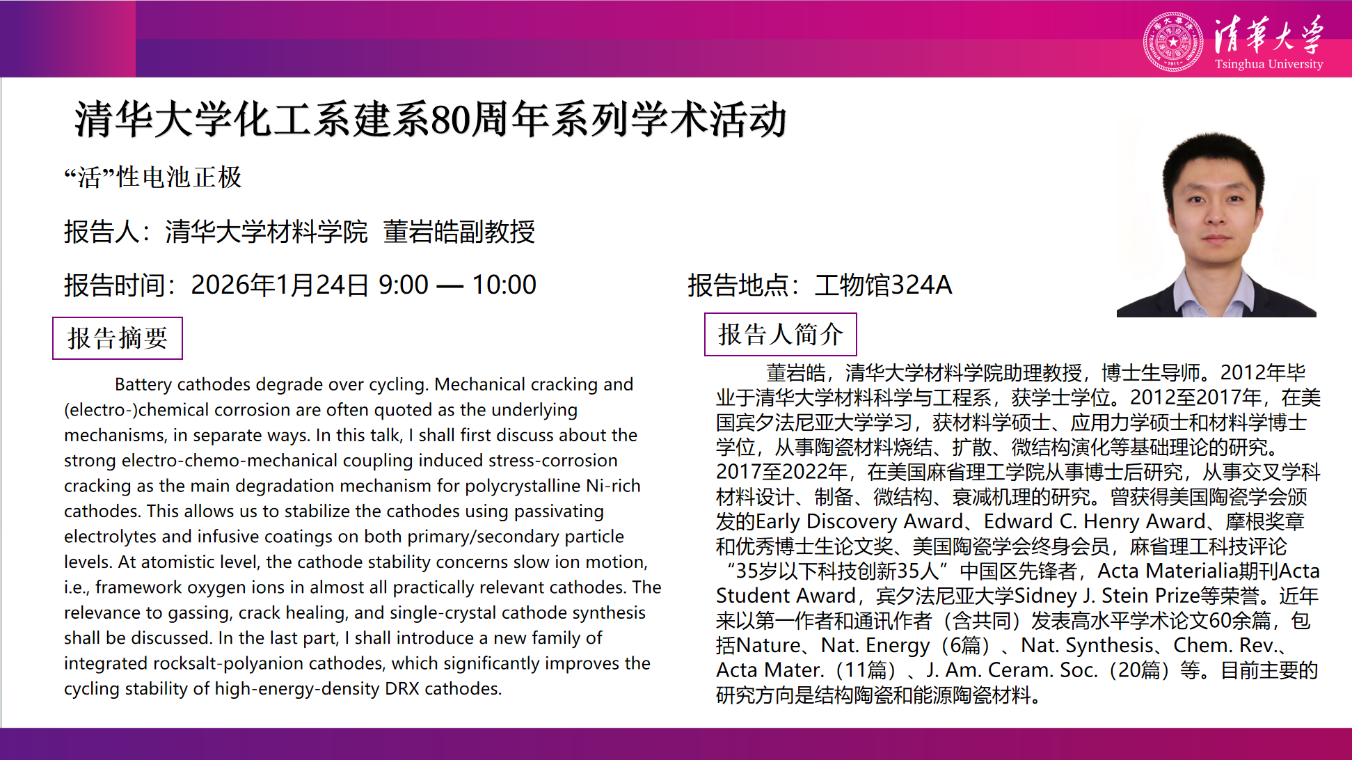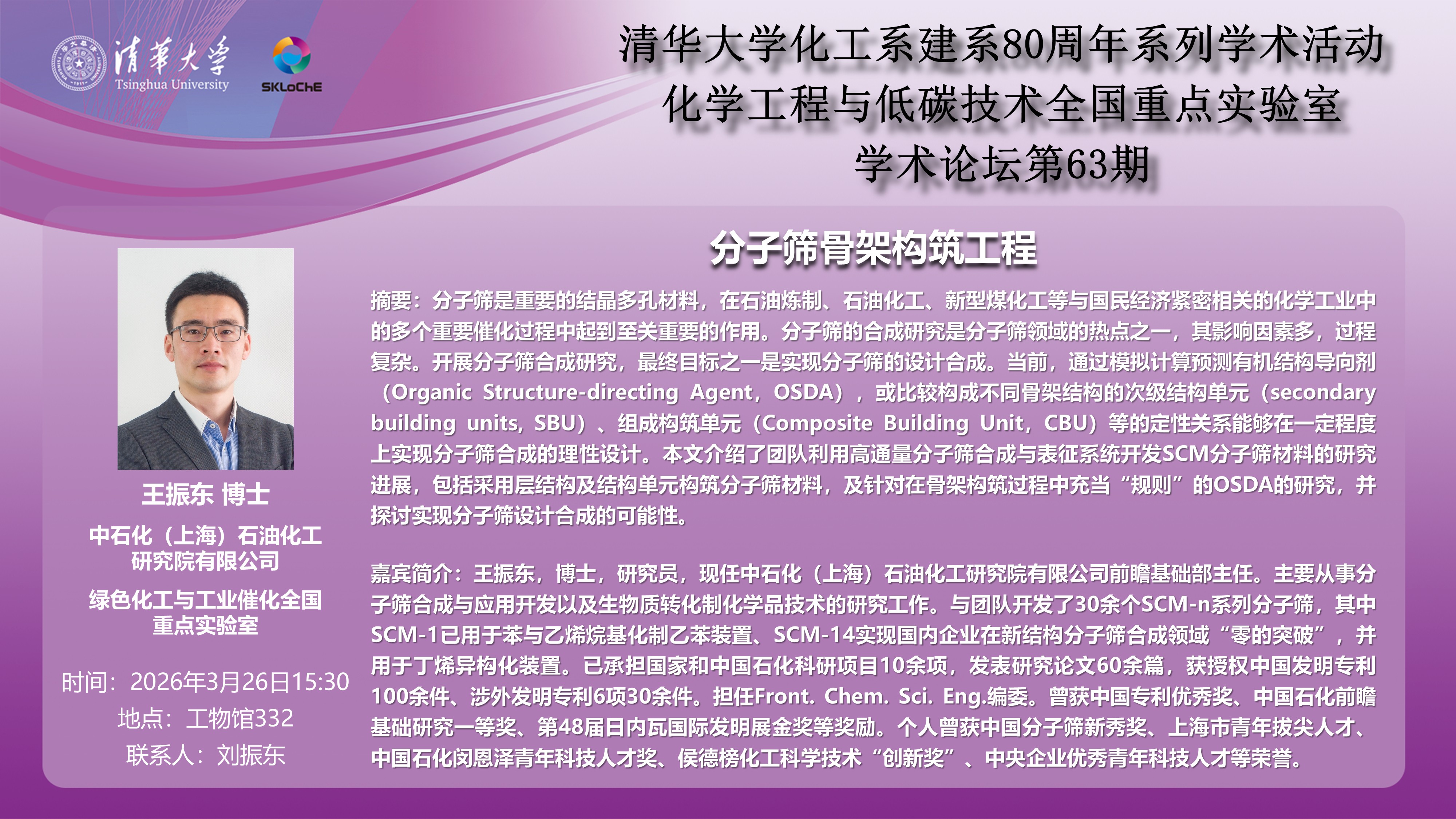 清华大学化学工程系始建于1946年,在半个多世纪的发展中,化工系始终坚持学科发展与国家需求相结合,工艺与工程研究相结合的方针,致力于建设学科布局合理、师资队伍和研究实力雄厚的工程科学系。 2...