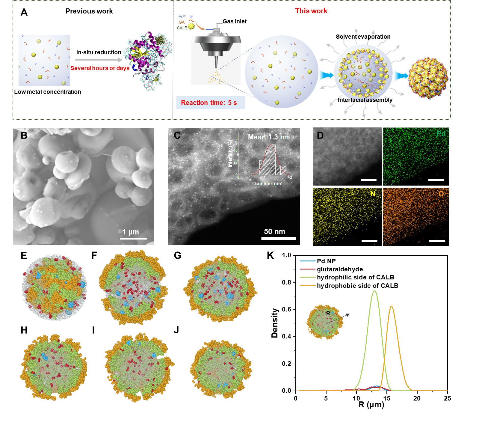 图1. 微液滴辅助法合成酶-金属复合催化剂 (A) 制备示意图;(B-D) 脂肪酶-钯亚纳米团簇复合催化剂表征;(E-K) 微液滴中酶-金属复合催化剂合成的DPD模拟。