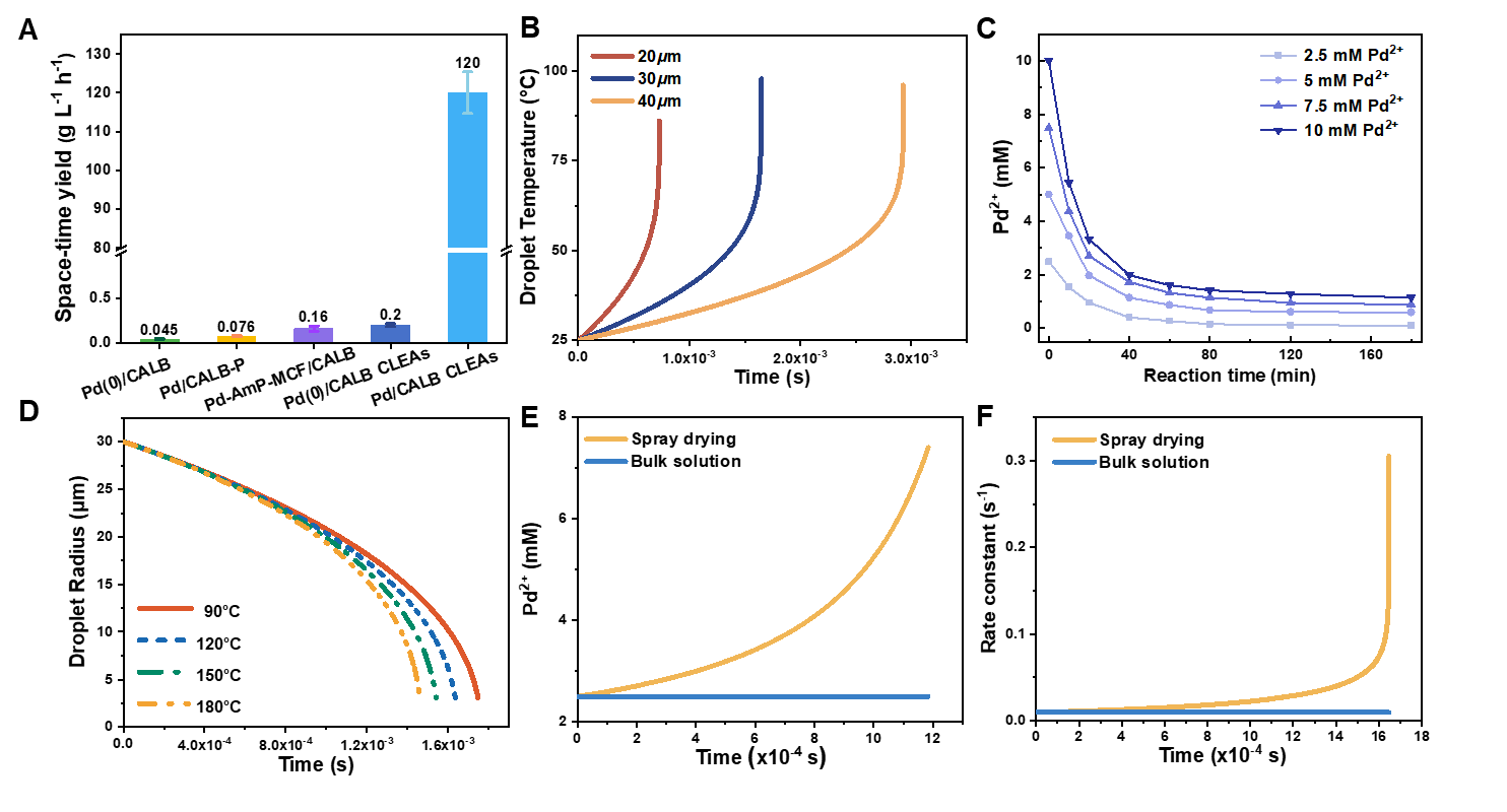 通过喷雾干燥技术,实现了从传统湿法浸渍方法的数天到数秒的反应时间的飞跃,时空产率提高了2-5个数量级(图1)。以脂肪酶-钯复合催化剂为例,制备的Pd/CALB CLEAs具有超小的 Pd 纳米团簇和良好保留的酶结构,在手性胺的动态动力学拆分(DKR)反应中表现出卓越的活性和选择性,产率高达92%,对映体过量(ee)值大于99%,且具有良好的可重复使用性。通过理论计算和实验研究,揭示了微滴中快速合成酶-金属复合催化剂的机制,包括快速溶剂蒸发和高效热传递(图2),为优化合成过程提供了理论依据。该方法具有连续、大规模生产的潜力,为工业应用提供了基础。未来,这种喷雾干燥方法有望进一步拓展到其他催化剂体系,为高效、绿色的化工合成提供新的技术路径,推动其在制药、化学品等领域的应用。