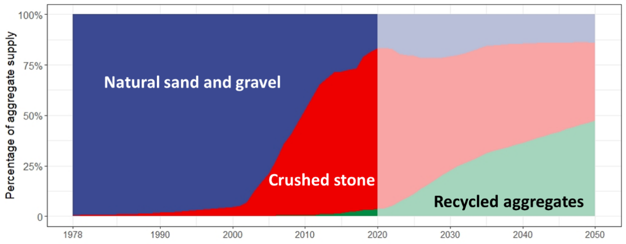 1978-2050年中国砂石资源供给侧分布(1978-2020为历史数据,2021-2050为全部循环经济举措情景下模型测算数据)
