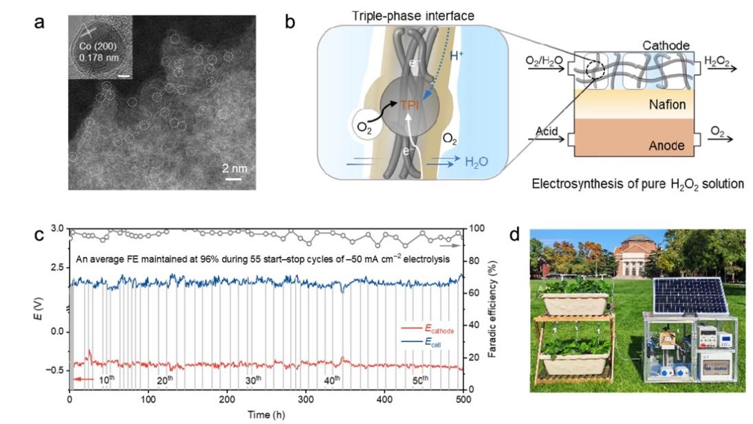 图2.(a)氧配位的钴单原子催化剂(b)电合成纯过氧化氢溶液的三相界面工程策略(c)500小时稳定性测试(d)用于智慧农业的绿电合成系统展示