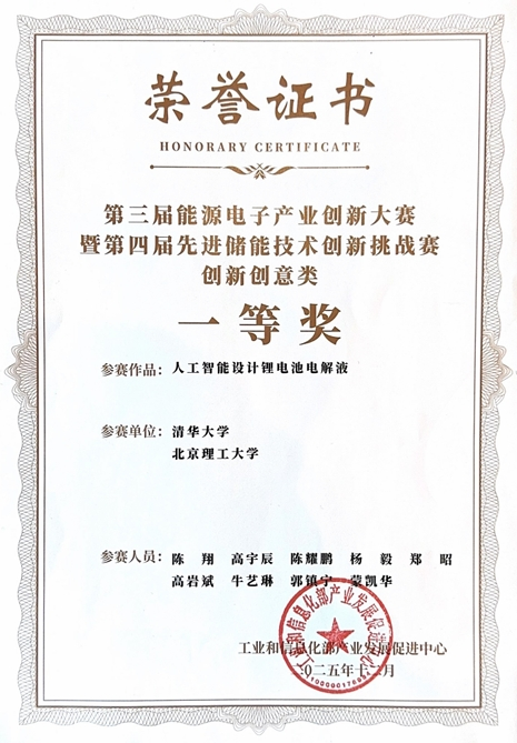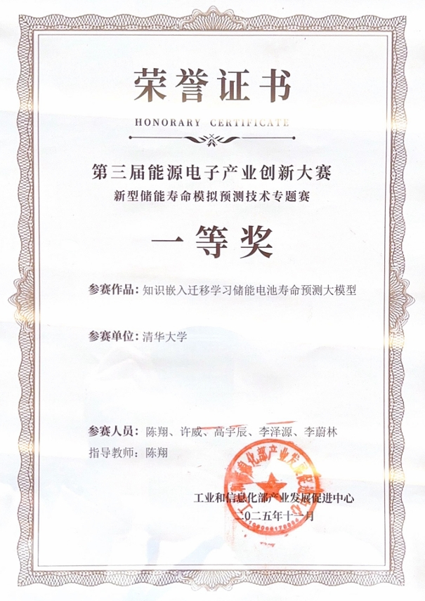新型储能寿命模拟预测技术专题赛一等奖证书
