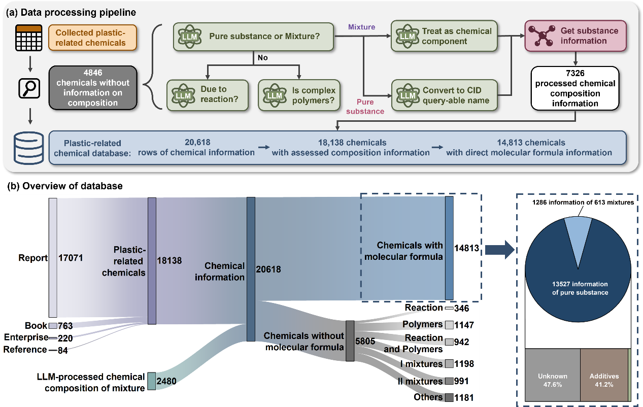 图2. 塑料相关化学品数据库全景图与基于大语言模型的化学组分解析工作流