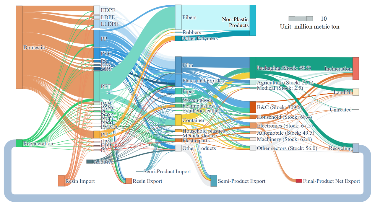 塑料的发明促进了人类社会进步,但塑料不当使用和管理造成的污染也困扰着世界。在联合国开展塑料污染治理政府间谈判以及中国加强塑料污染全链条治理的双重背景下,深入认知中国塑料的社会经济代谢过程,系统性把握塑料在“生产-使用-废弃-循环”全链条各环节的物质流量与存量变化,对洞察塑料产业发展演变、发展循环经济、完善塑料污染治理政策具有重要意义。尽管学界已经对中国塑料社会经济代谢开展了一定研究,但现有数据在塑料品类覆盖、时间序列范围和数据分辨率等方面仍存在显著不足,缺乏系统公开、可复现的数据集,难以为均衡、有效的政策制定和完善提供科学支撑。