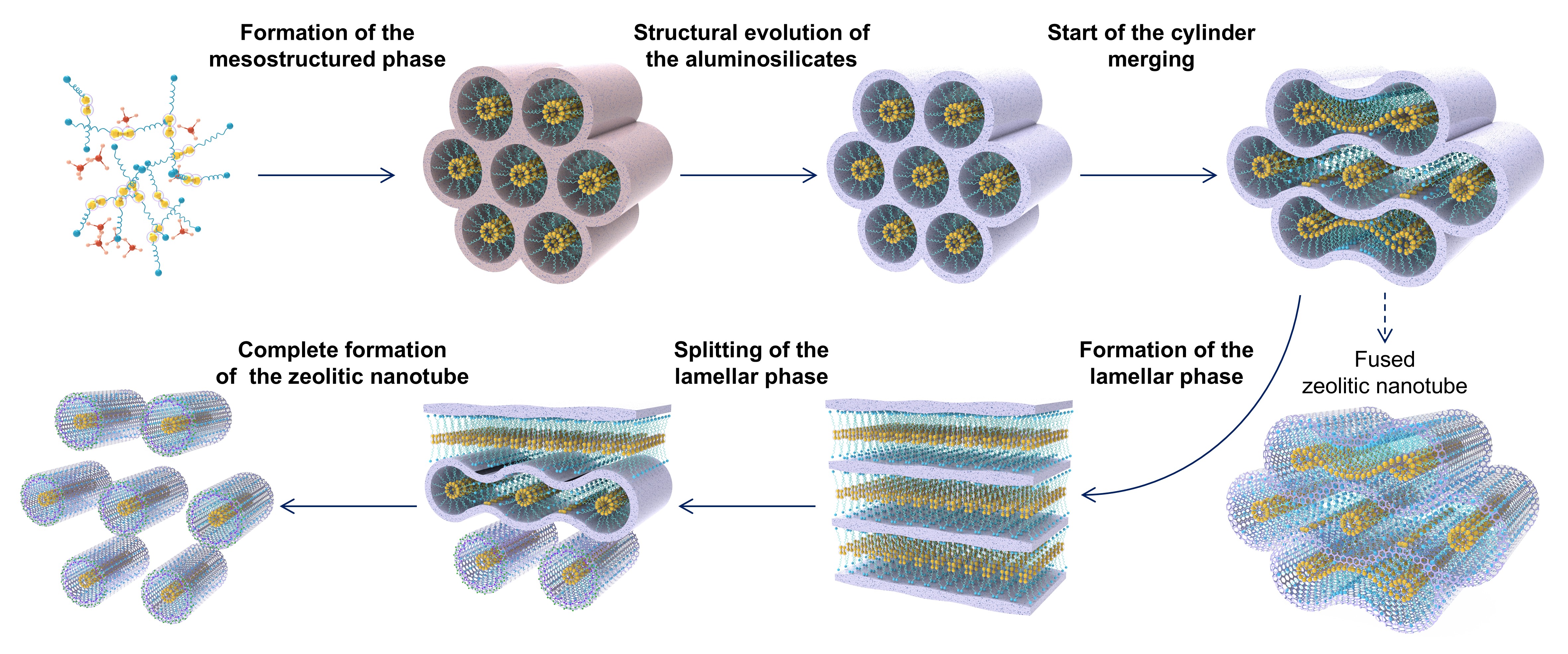 本研究通过时间分辨与多尺度结构表征,明确指出单壁分子筛纳米管并非通过单一步骤直接生成,而是经历由无机短程有序演化所触发的连续结构重构过程:无机骨架片段的电荷密度与有序程度逐步演变改变了有机–无机组装体的相互作用与界面形态,从而推动介观结构的演变,最终实现了纳米管从层状非稳态相的脱离与闭合。该机制框架将“介观组装”与“分子筛晶化”统一描述,揭示了单壁分子筛纳米管从组装到成形的关键控制逻辑。
