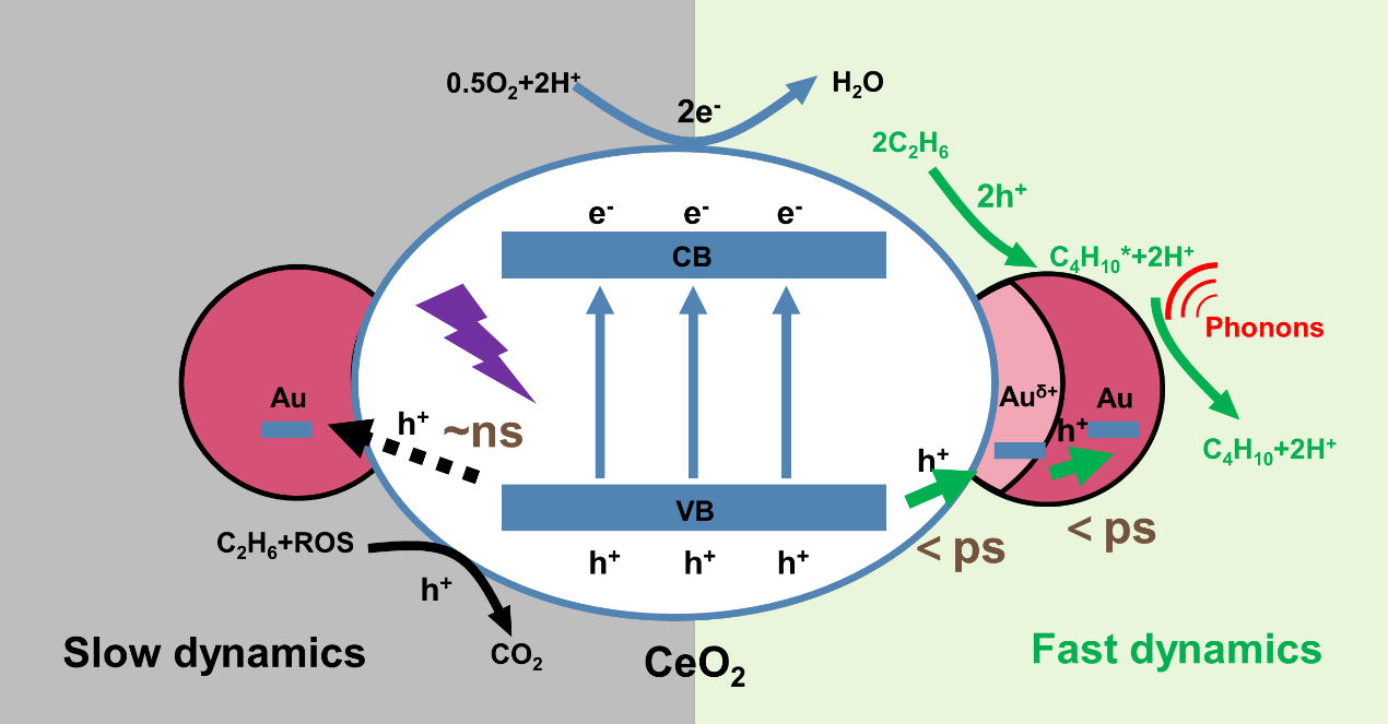 近日,清华大学化工系唐军旺教授团队领衔,与中石化(北京)化工研究院有限公司合作,设计了一种电子传递桥梁Auδ+,打通了电荷从载体CeO2到活性位Au颗粒的高效电荷传递,首次实现光和热协同氧气氧化高选择性乙烷偶联制丁烷。该桥梁策略将空穴转移时间尺度从纳秒量级提升至皮秒量级,从而显著抑制了碳链断裂副反应,实现了丁烷产率与选择性的双重提升。
